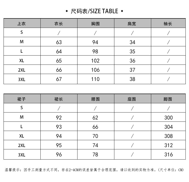 1)  視產品而定,通常尺碼表所示數據都是平鋪測量的,尺寸測量可能會出現一些誤差(約 1 至 3 厘米)。